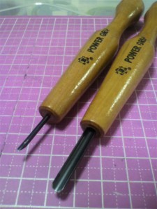 彫刻刀はPOWERGRIPの丸刀を二本、1.5mmと4.5mmです